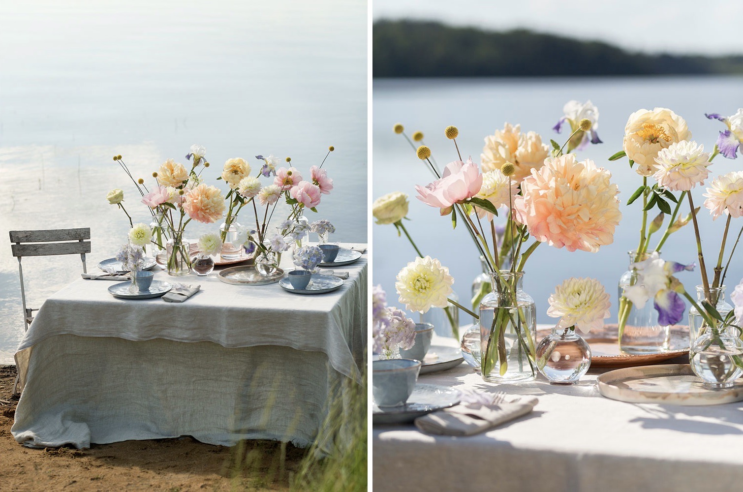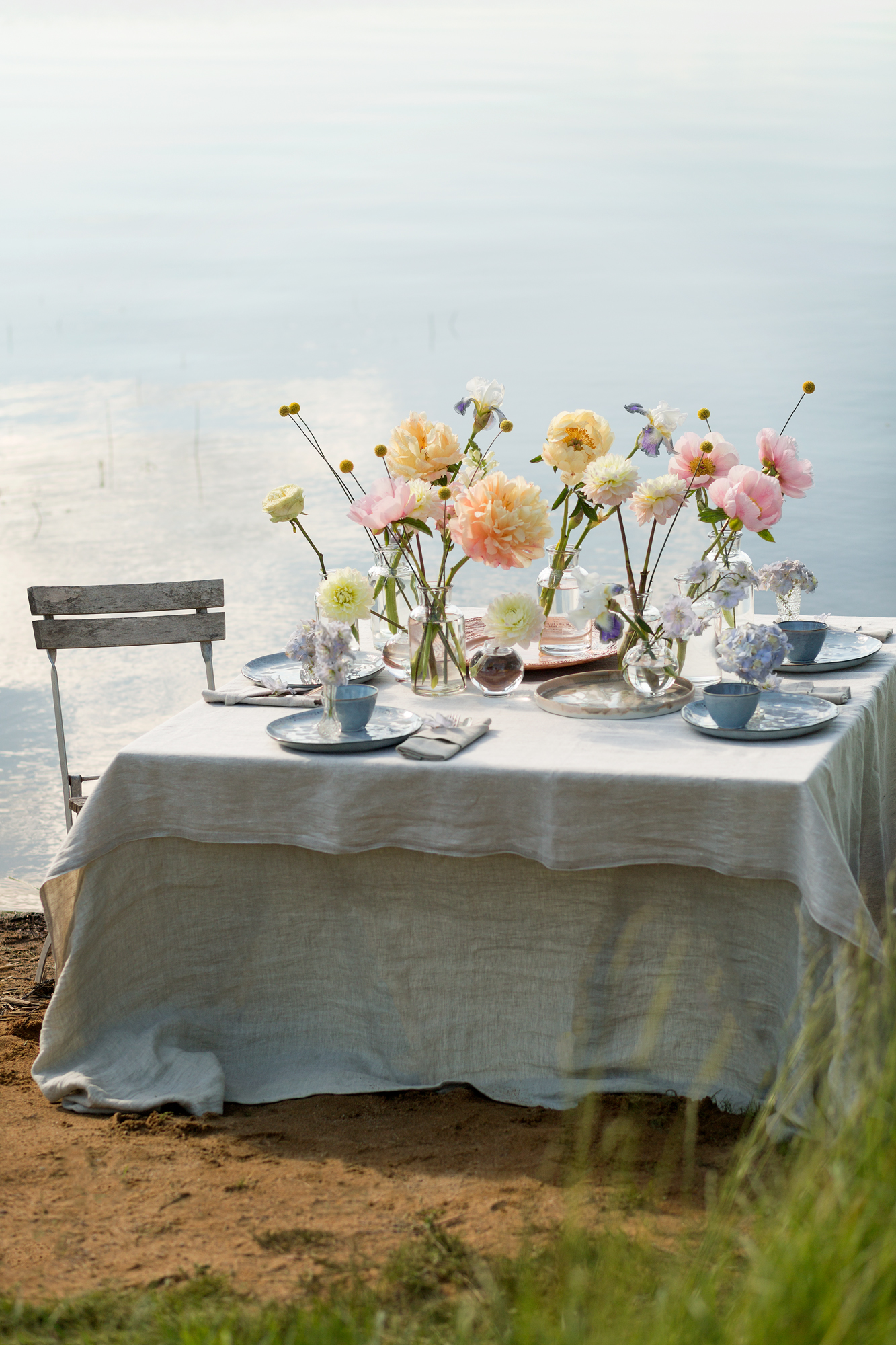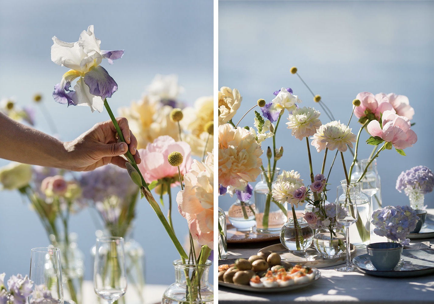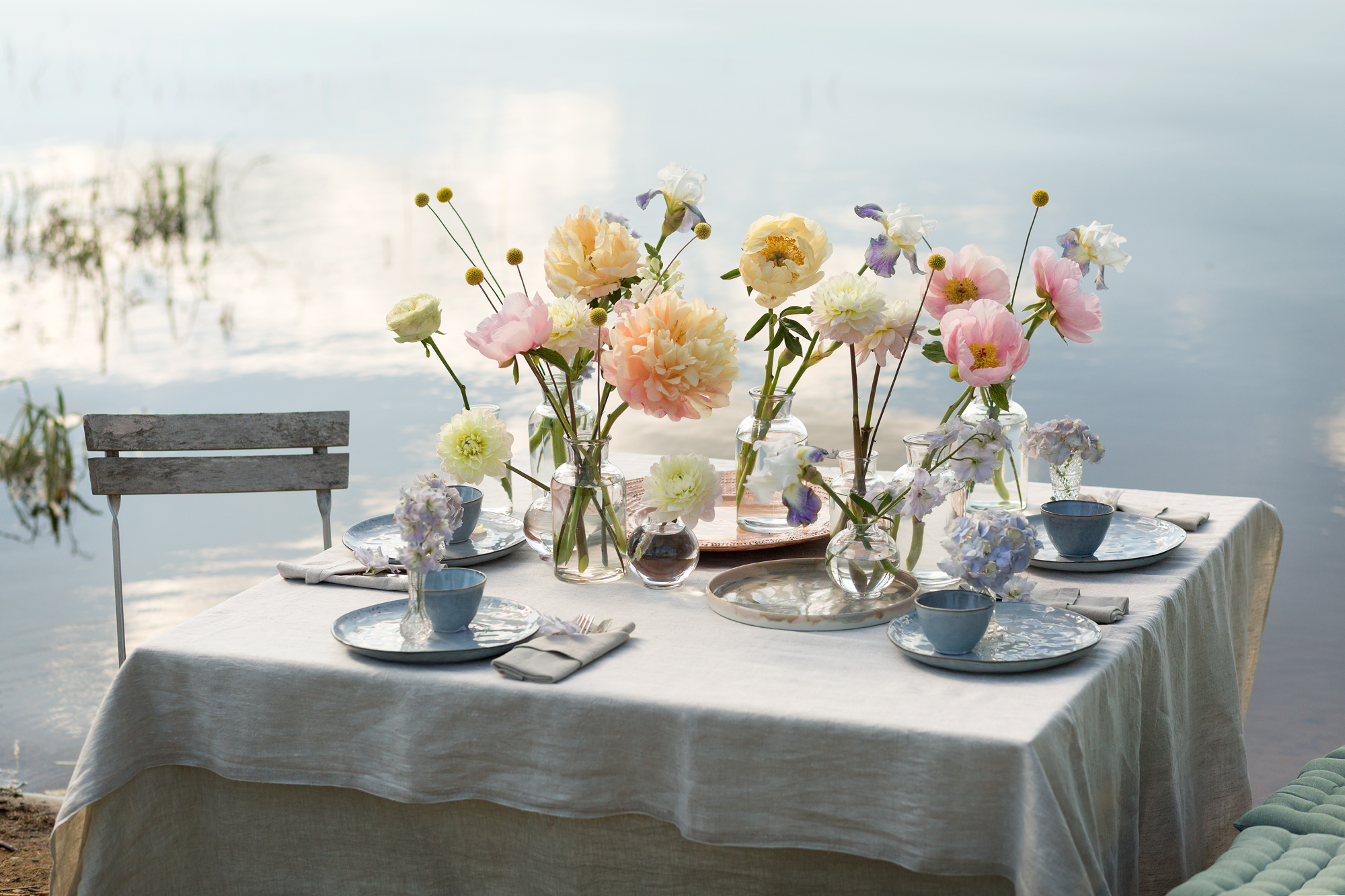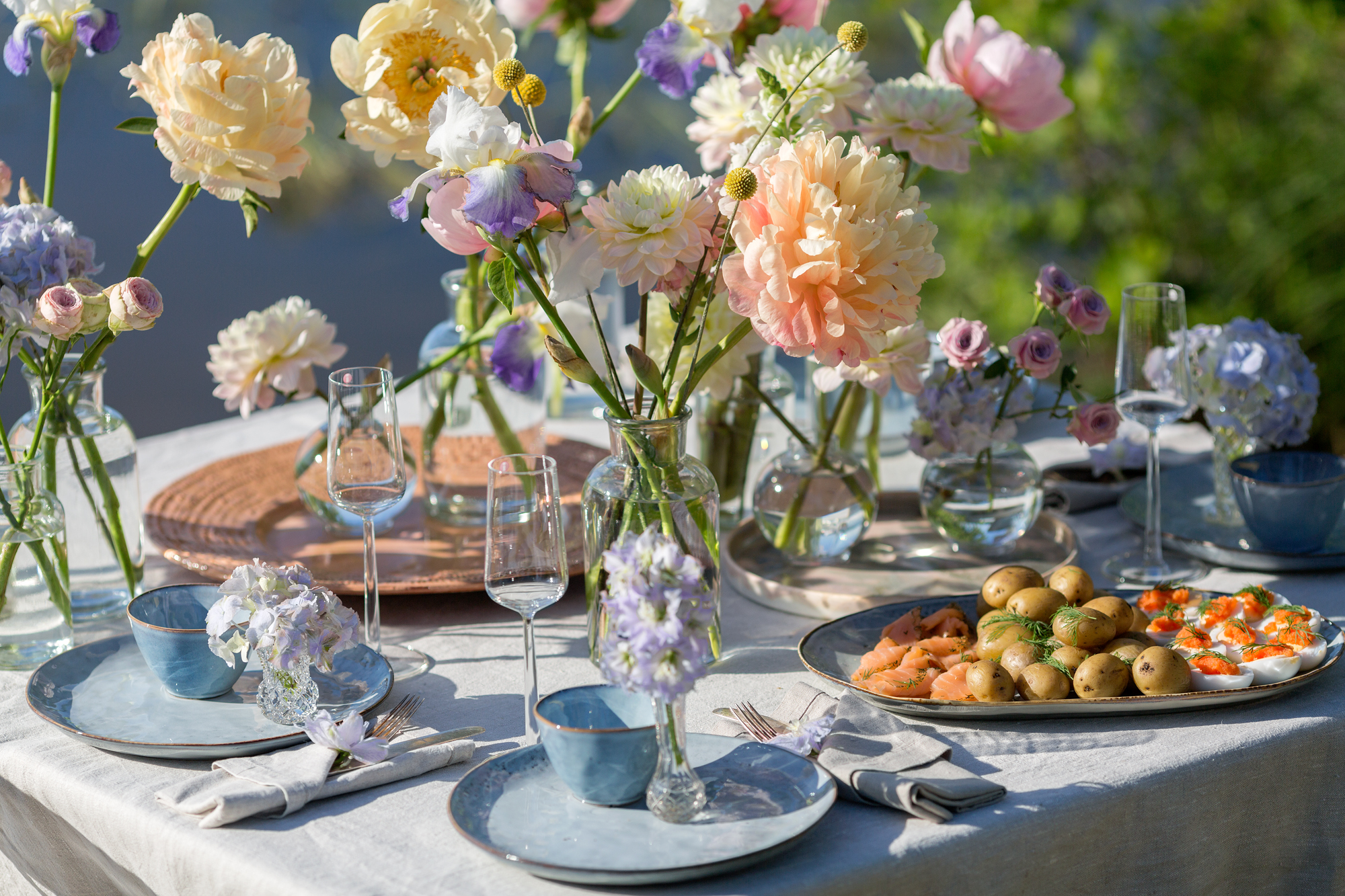 Blommor i dukningen: pioner, dahlia, solboll, iris, riddarsporre, trädgårdsros, kvistros, hortensia, lejongap.