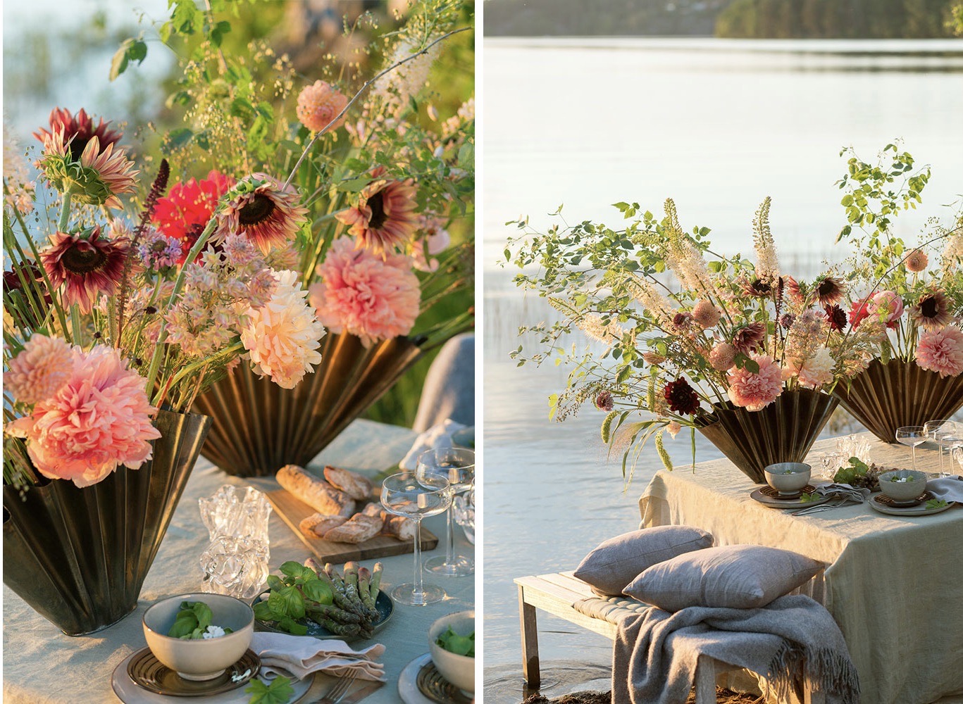Äntligen är tiden här för att duka upp utomhus med solnedgången som fond. Inspireras av tre olika blomsterdukningar som förhöjer upplevelsen vid sommarens festligheter.